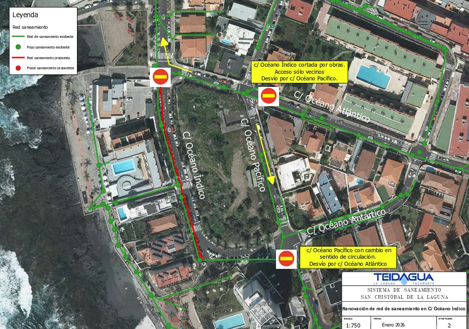 Teidagua, empresa de Abastecimiento y Saneamiento de los municipios de La Laguna y Tacoronte, les informa que realizaremos obras de alcantarillado en la Calle Océano Índico en Punta del Hidalgo, La Laguna, que ocasionarán modificaciones en el tráfico desde el lunes 28 de enero hasta el 20 de febrero de 2026.